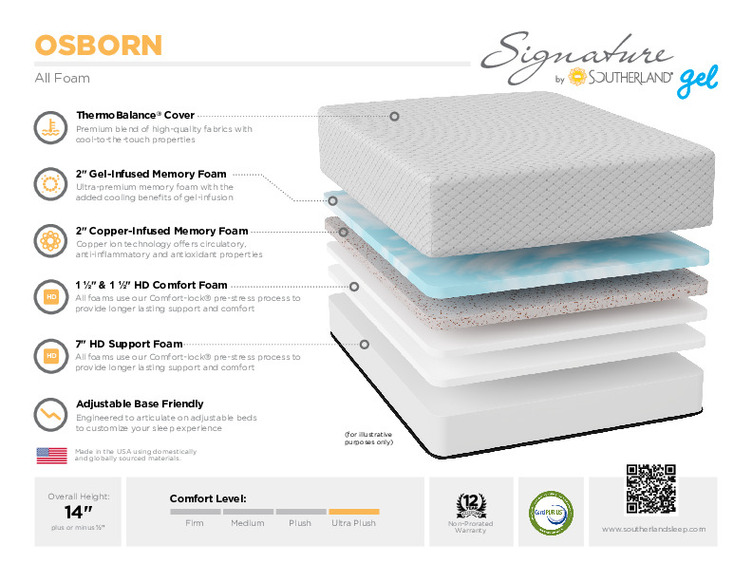 If you’re looking for a mattress that surrounds you in wonderful plushness, Come try the Osborn. This high end gel foam mattress has all of the good stuff. It will slowly contour to your body shape and cradle you in comfort but still provide amazing support.